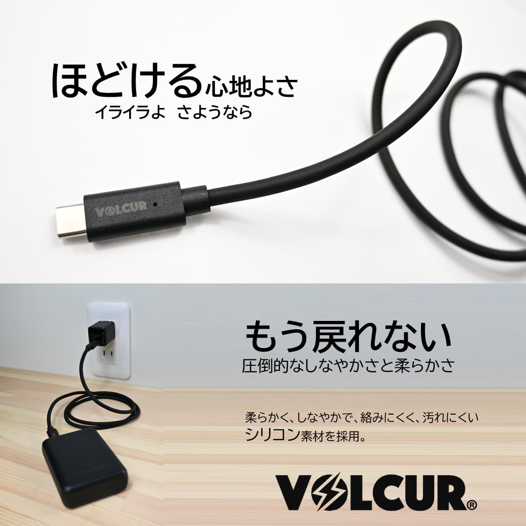 ケーブルは、柔らかく、しなやか、絡みにくく、汚れにくい シリコン素材を採用。